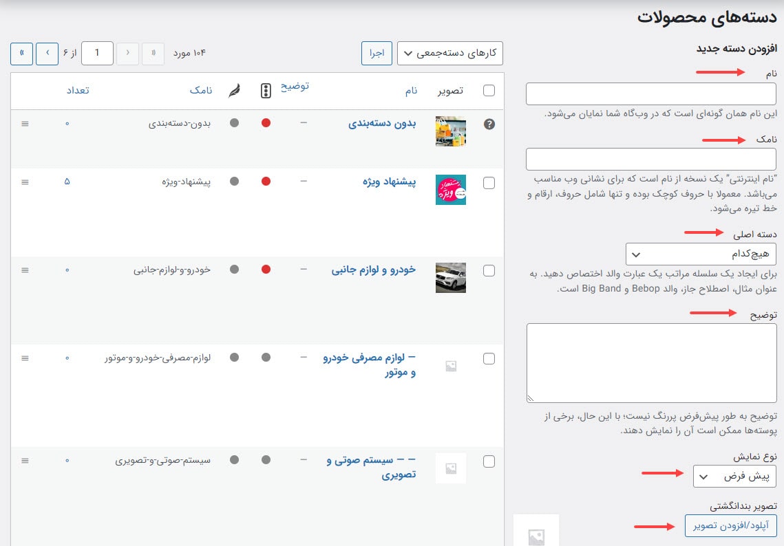 برای ساخت دسنه بندی جدید باید اطلاعاتی مانند نام، نامک، دسته مادر و توضیح، نوع نمایش، تصویر بند انگشتی را تکمیل کرده و با فشردن دکمه افزودن دسته تازه یک دسته جدید ایجاد کنید. شاید برای شما سوال باشد که هر بخش چطور باید پر شود که در ادامه به شما می گوییم هر بخش را چطور پر کنید.